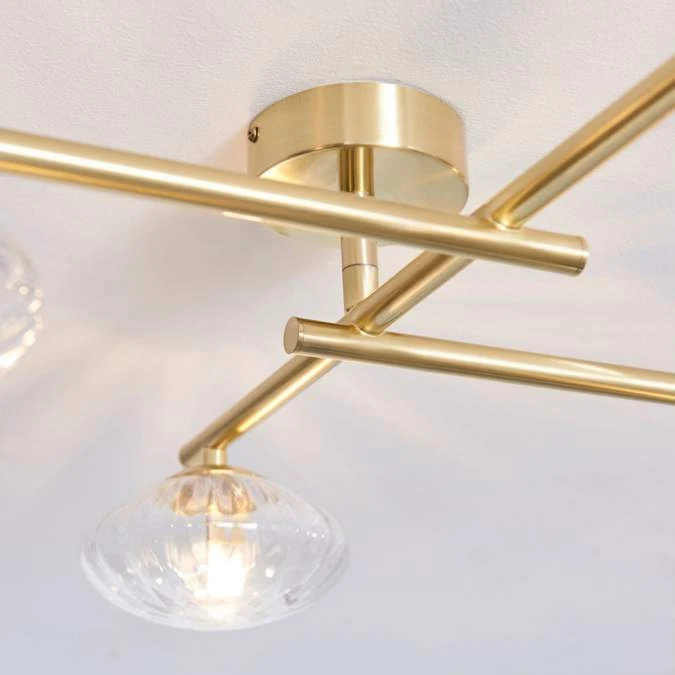 - Satin brass effect metalwork with clear ribbed glass diffuser