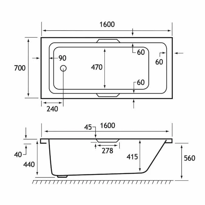 Beaufort Portland 5mm 1600 x 700mm Twin Grip Single Ended Bath.
