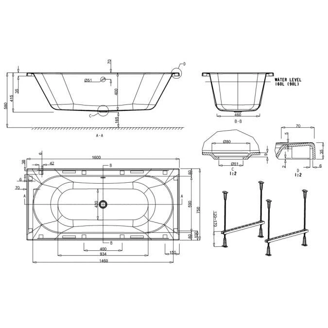 - Displaced capacity : 90Â litres (bath’s capacity less 70 litres)