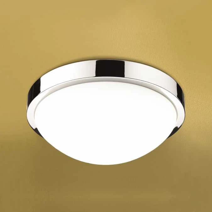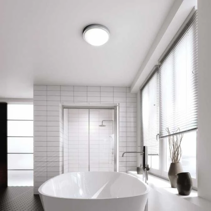 HIB Momentum LED illuminated circular light with chrome detail and diffused shade. 18 Watt LED. 1296 lumens, The domed glass shade gives a touch of elegance to this timeless piece.