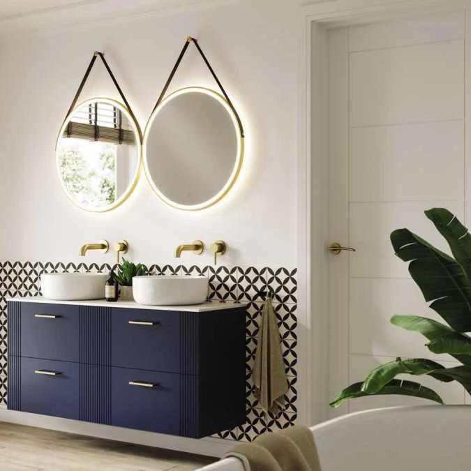 HIB Solstice 80 Circular Illuminated Mirror with Strap – For a designer look that works in a classic or contemporary setting, consider the Solstice. This statement mirror is available in two finishes and sizes, an industrial matt black and brushed brass and includes a feature hanging strap. The bold style is complemented by a halo of ambient backlight and a ring of colour temperature changing LED lighting, which offers customisable frontal illumination. Internal heated pads keep the glass clear and free from condensation, for a flawless and functional bathroom centrepiece.
