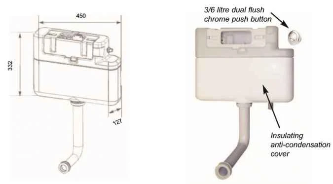 The Dual Flush Concealed Cistern Fits in Furniture‐ At only 450mm wide Prozone furniture cisterns are specifically designed to fit into even the smallest furniture units. Storage‐ Furniture hides ugly pipework and provides storage. Eco ‐ Save water with a Prozone 3/6 litre dual flush concealed cistern.