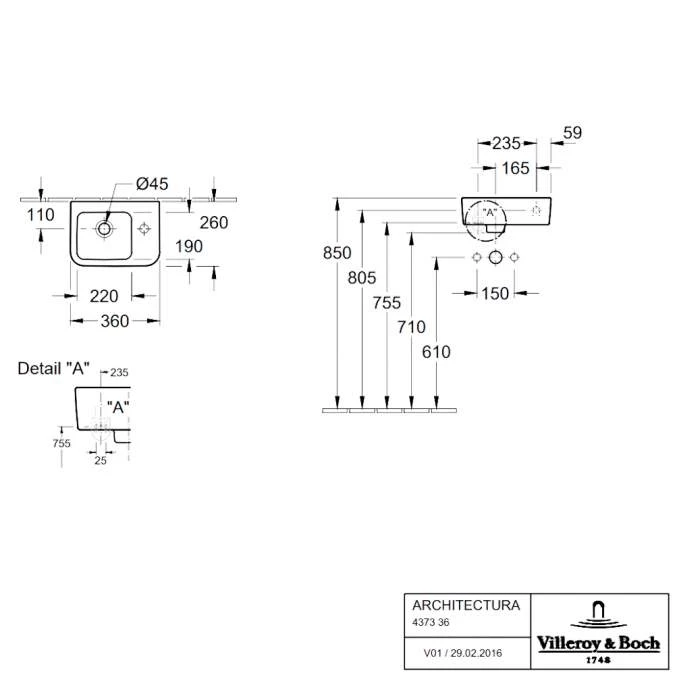 Villeroy & Boch Architectura Hand Washbasin, 360mm With Overflow – 43733601