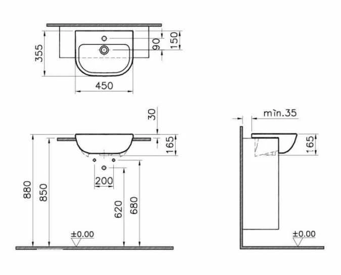 The VitrA S20 Short Projection Semi-recessed basin measures 450mm wide and 355mm in depth. The recess is 200mm and the front projection is 155mm.Â