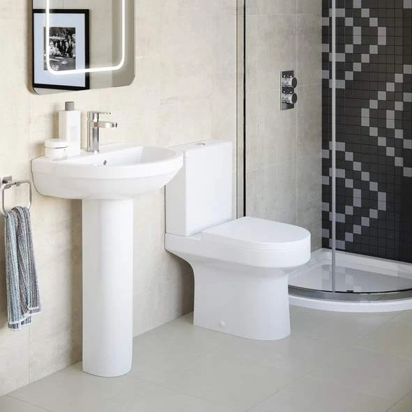 The Whistle 4 piece bathroom suite comes complete with: the Whistle one tap hole basin & full pedestal, close coupled WC with soft close seat.